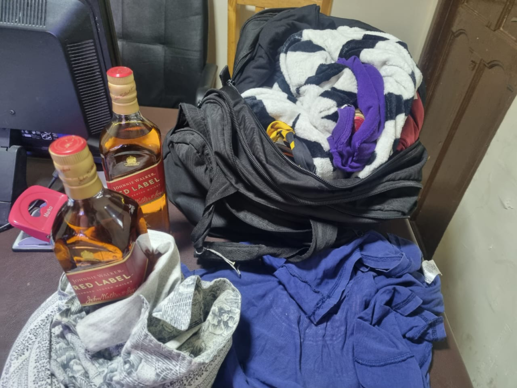 Para su conformidad, a horas 16:00 pm. aproximadamente cuando se encontraba realizando el ingreso de visitas varones, se pudo observar al Sr. Julio Cesar Cortez Melgar, con un bolsón color negro, de manera sospechosa, al momento de intervenirlo actuó de manera nerviosa, por lo cual se le pidió que abriera el bolsón donde se encontró 5 Wiskis color rojo «Johnnie Walker» y 4 botellas de Alcohol «Caimán», hábilmente camufladas entre ropas, indicando que era para el Privado de Libertad Jorge Sandoval del Sector Los Pinos.